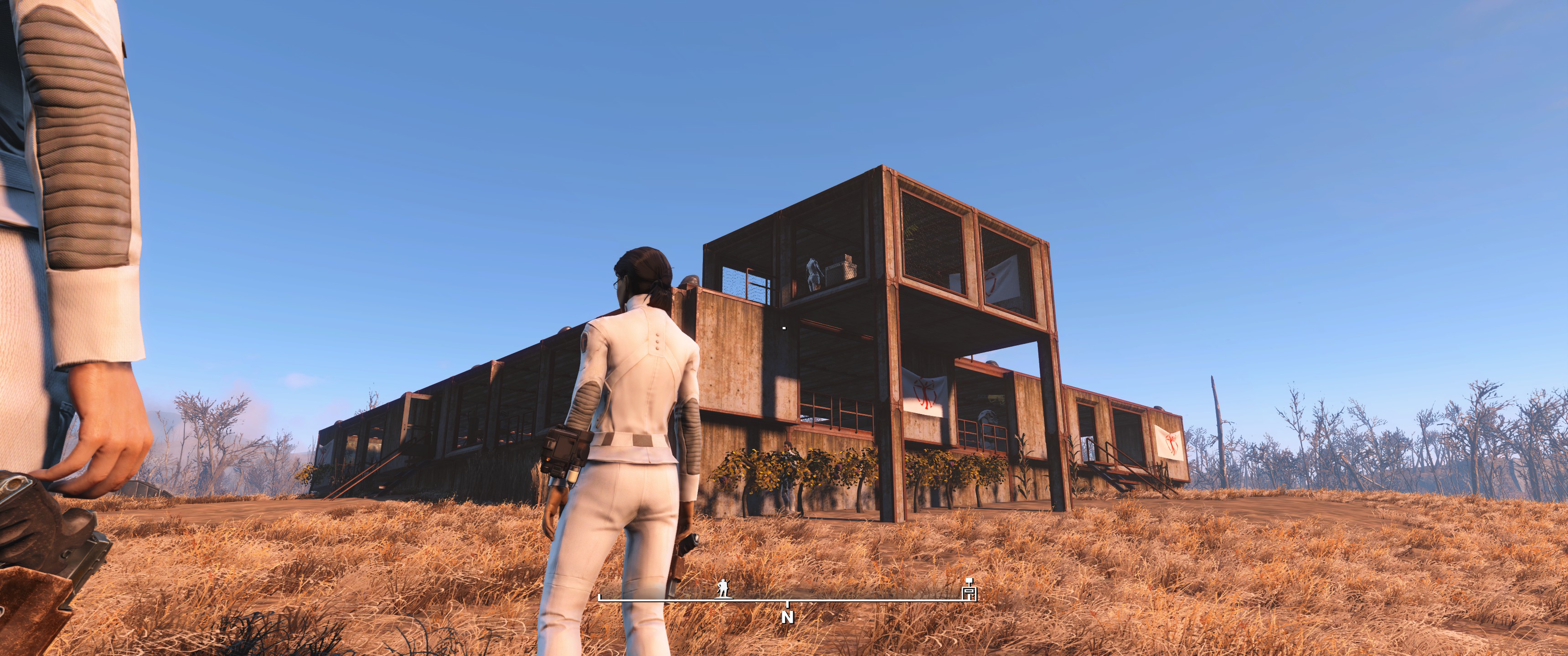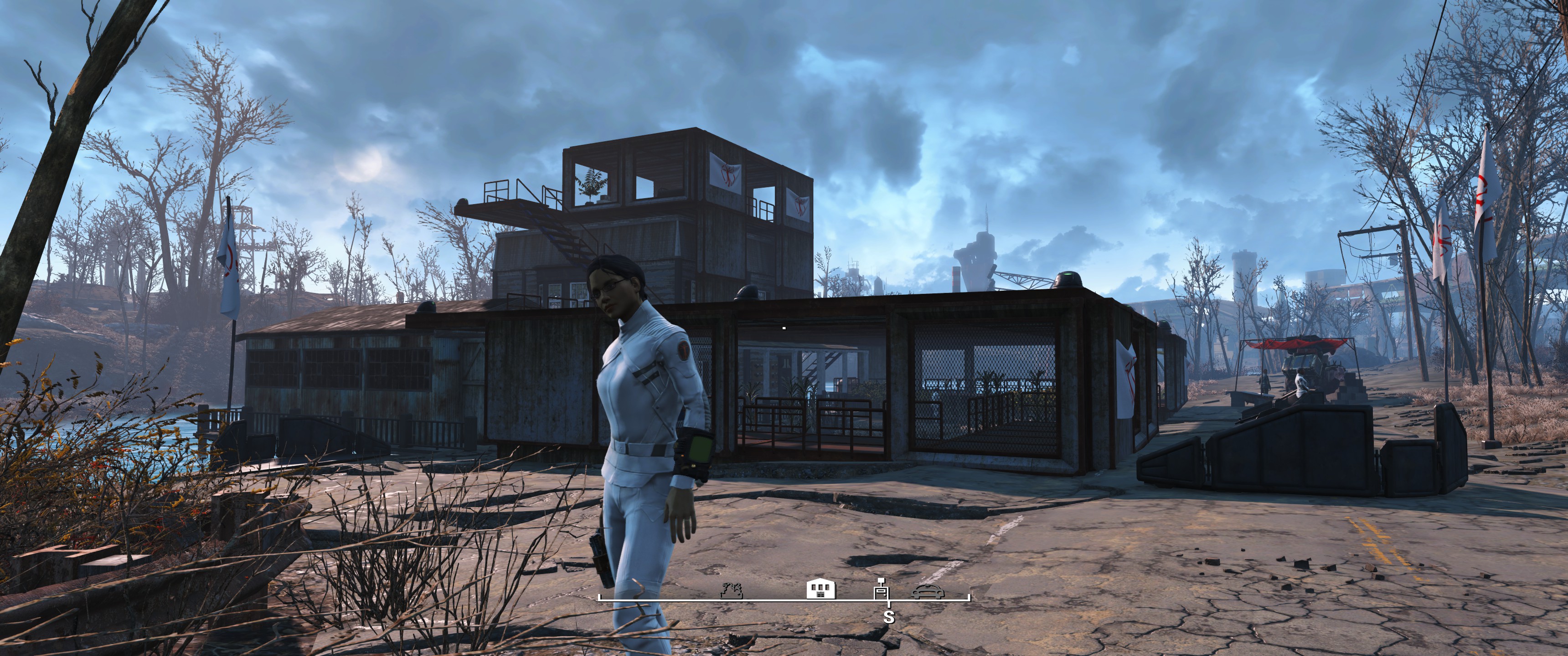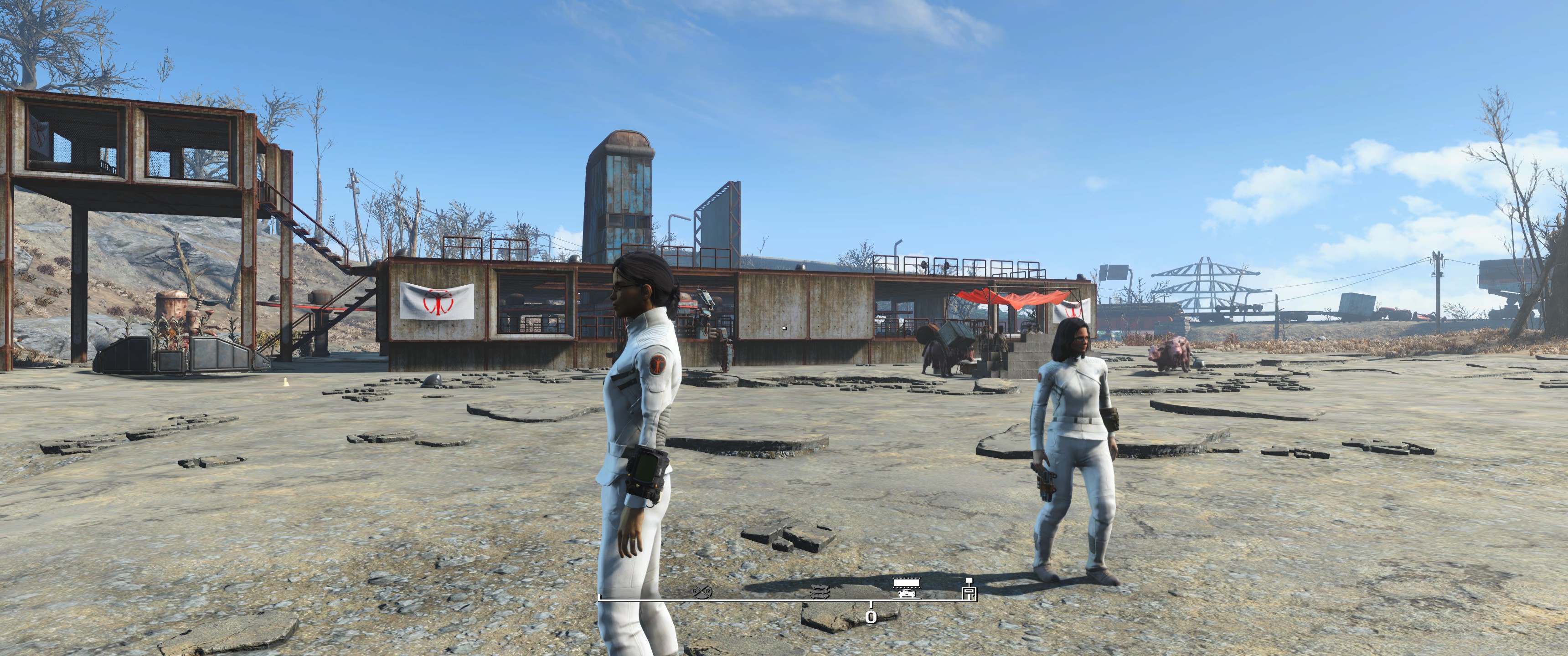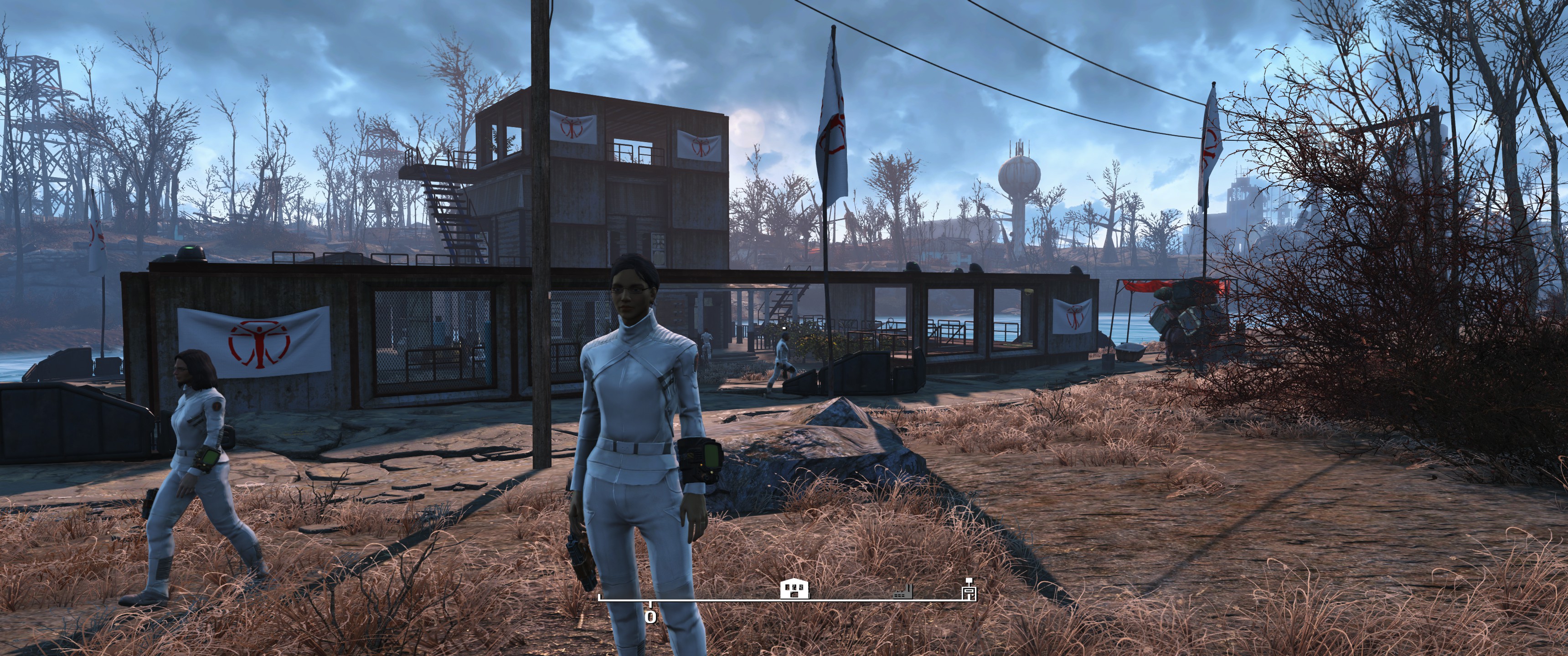 Hier lege ich meist zu Beginn Sanctuary fest, die Siedler werden mit den Synth Uniformen buchstäblich uniformiert, mit Laserwaffen ausstaffiert und die Siedlungen / Möbel etc. halte ich gerne in weiß / hellen Tönen. Schön und sauber möbliert.