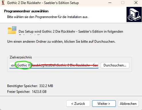Wichtig! Der Installationspfad muss vor der Installation manuell zum Gothic II Verzeichnis angepasst werden, siehe Spoiler: