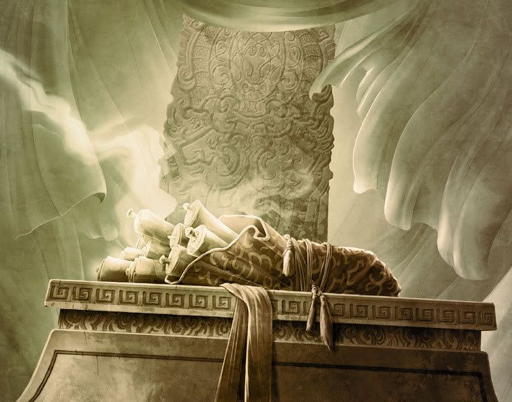 Nachdem er eine Weile in den Schriften gewühlt hatte, fiel er abermals in sein Verhaltensmuster zurück. Wo war seine hoch gepriesene Magie, dass er nicht einmal Repliken der Pergamente anfertigen konnte? "Wenn es unbedingt notwendig ist, nehmt die Schriften an euch, das sind lediglich Abschriften der großen Steintafeln, die ihr hier seht." sprach sie abweisend zu dem Priester. Besser er nahm die Schriften an sich, als wenn er noch stundenlang hier bliebe, um den Text mühselig abzuschreiben. Das ließ er sich auch nicht zweimal sagen, griff sich Rollen, so viele er in die Arme bekam, kramte noch einmal herum um sicher zu gehen, nicht doch noch etwas Interessantes übersehen zu haben und machte kehrt, wieder auf den Weg nach draußen, wo Nicolei, wartend auf die Beiden, zurück geblieben war. Triella konnte es ihm nicht verdenken, dass er sich aus dieser Sache heraus halten wollte.