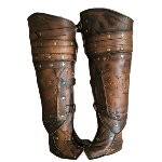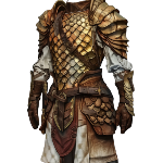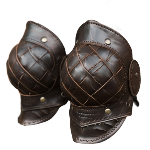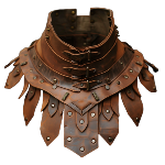 Schild in Form eines Dreiecks aus dünnem Holz mit Lederüberzug. Er deckt den Bereich zwischen Schulter und Knie ab und schützt durch seine Breite fast den gesamten Oberkörper. |